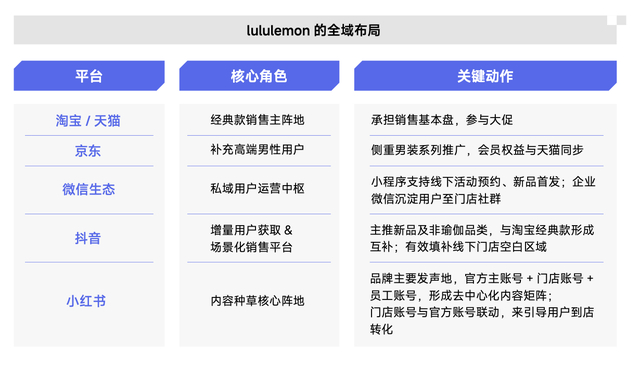 这些海外运动品牌们目前早已进行有层次的全域布局,如lululemon以线下直营店作为体验中心,线上则覆盖淘天、京东、抖音、微信小程序多个平台——完全可以称得上是一个“全域玩家”。但和中国本土运动品牌、以及那些被纳入中国集团麾下的国际品牌不同,它没有在小红书开设店铺,只是将它作为一个品牌宣传的渠道,用于纯种草和社群活动招募。