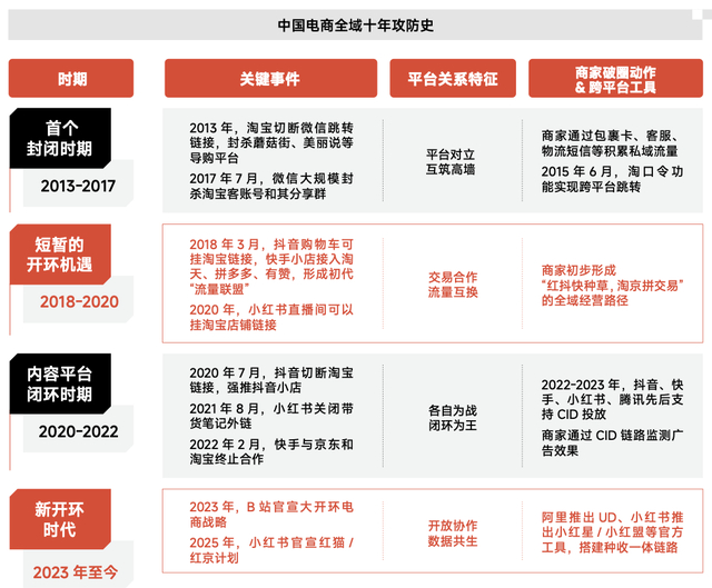 以2003年淘宝诞生为起点,中国电商发展20多年,被视作“流量终点”的货架电商们始终在从外部平台引入流量。如果我们将2013年蘑菇街和美丽说被淘宝“封锁”视作一个关键节点,全域电商攻防史也已超过十年。