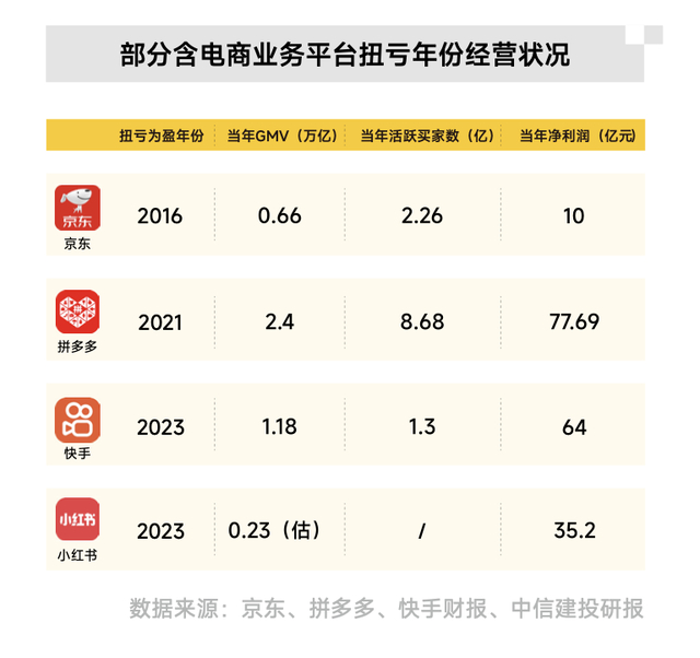 2016年京东扭亏为盈,GMV达到6582亿元,净利润达到了10亿元;2021年拼多多扭亏为盈,GMV达到2.4万亿,净利润为77.69亿元;同样为内容+电商平台的快手,2023年扭亏为盈,GMV为1.18万亿元,当年净利润64亿元。
