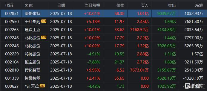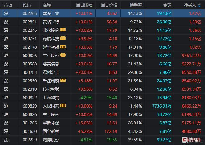 龙虎榜单日净买入额前三为建设工业、麦格米特、熙菱信息,分别为1.47亿元、1.39亿元、9222.71万元。