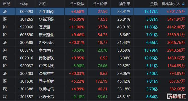 龙虎榜中涉及机构专用席位的个股中,当日净买入额前三为力生制药、华新环保、万源通,分别为6301.15万元、5471.91万元、4142.4万元。