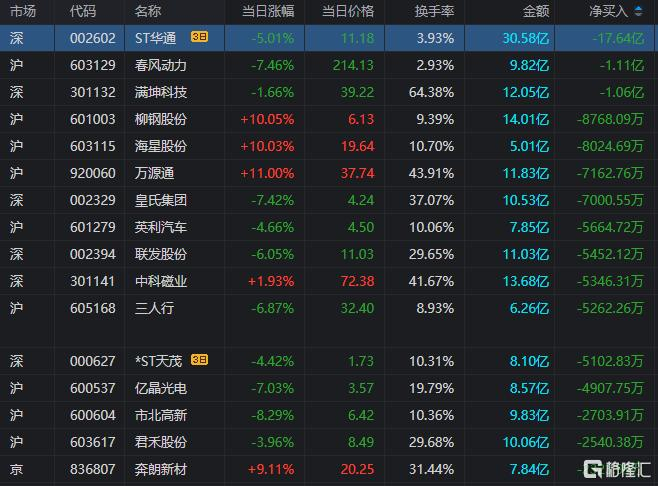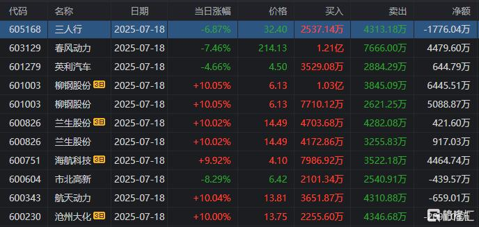 龙虎榜中涉及机构专用席位的个股中,当日净卖出额前三为春风动力、柳钢股份、中科磁业,分别为1.96亿元、6970.67万元、5124.24万元。