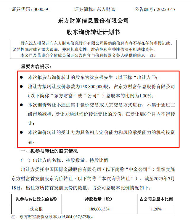 财联社7月18日讯(记者高艳云)有着“券茅”之称的东方财富迎来股东股权转让事宜。7月18日,东方财富发布公告,公司股东沈友根拟询价转让1.59亿股公司股份,占公司总股本的比例为1%。公开资料显示,沈友根为东方财富第七大股东,持有公司股份占比1.2%,此次近乎清仓式退出。