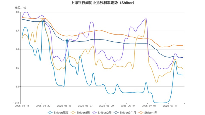 上海银行间同业拆放利率(Shibor)几乎原地踏步。具体来看,隔夜Shibor下跌0.10BP,报1.4620%;7天Shibor下跌1.00BP,报1.4940%;14天Shibor上涨0.70BP,报1.5600%。