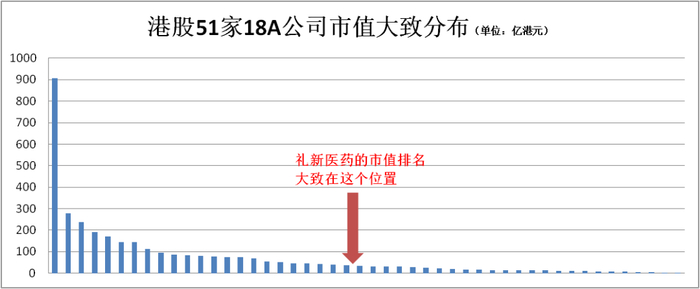 截至7月8日,港股18A公司共有51家,市值最高的科伦博泰达906亿港元,市值排在中位数的是健世科技,不到35亿港元。如果把礼新医药排进来,市值将比一半的18A公司都高。