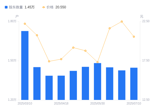 7月18日消息,数据显示,截至2025年7月10日,隆利科技A股股东总户数为1.45万户,较上期(2025年6月30日)增加202户,增幅1.42%。公司最新A股总股本为2.28亿股,其中流通A股1.57亿股,户均持有流通A股数量为1.09万股,较上期减少154.15股,降幅1.40%;户均持流通A股市值22.35万元,较上期减少2.45万元,降幅9.86%。