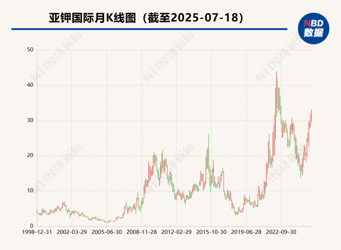 郭柏春2020年1月10日上任亚钾国际董事长,当日公司股价以6.42元/股(前复权,下同)收盘。而两年多后的2022年4月14日,亚钾国际盘中创出43.92元/股的历史新高。也就是说,郭柏春任期内,亚钾国际股价一度累计上涨558.94%。