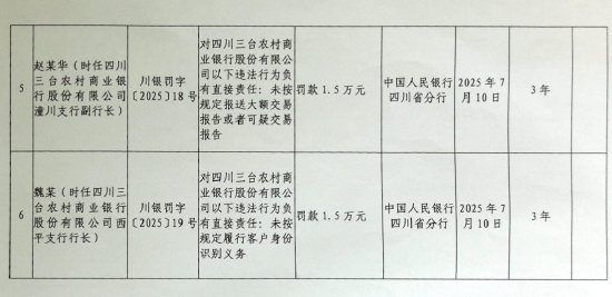 刘某(时任四川三台农村商业银行股份有限公司会计运营部总经理)对该行未按规定履行客户身份识别义务和未按规定报送大额交易报告或者可疑交易报告负有直接责任,被罚款3万元。
