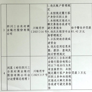 四川三台农村商业银行被罚85.42万元:违反账户管理规定等