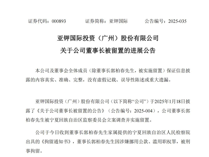 2024年3月30日,亚钾国际发布公告称,于3月29日收到《宁夏回族自治区监察委员会留置通知书》,董事长郭柏春在其任职宁夏回族自治区银川市副市长期间,因涉嫌渎职犯罪,目前被宁夏回族自治区监察委员会立案调查并实施留置。