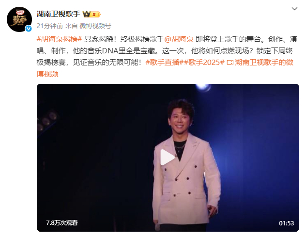 7月18日晚,湖南卫视《歌手》官宣终极揭榜歌手为“初代歌王”胡海泉。此外,胡海泉还在《歌手2025》中担任音乐串讲人。另一位从草原走来,曾六登春晚,是位了不起的民族唱将。”网友曝料为云飞。
