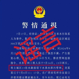 央广网杭州7月18日消息(记者 尚天宇)记者从杭州市互联网信息办公室、杭州市公安局获悉,网传“7月18日余杭分局良渚派出所通报称杭州水务集团干部刘某某将主城区13处水路接驳下水排污管网后潜逃出境”,此“通报”为不实信息,请广大市民朋友,对未经核实的信息不信谣、不传谣。