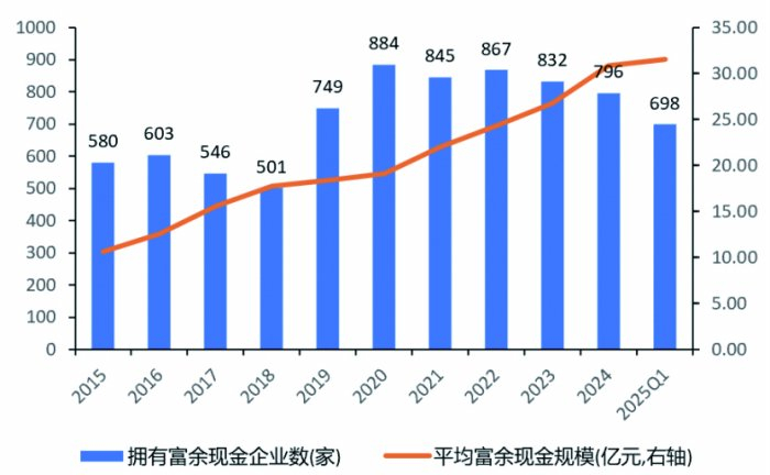 另一方面,不少A股上市公司富余现金充裕,具备开展回购的资金实力。以披露数据较为完整的3322家上市公司为样本,可以发现2015年拥有富余现金(上市公司广义现金减去经营所必需的现金,必需现金按照营业收入乘以5%来计算)的公司数是580家,但2025年一季度已上升至698家。并且,平均富余现金规模也明显提升,从2015年的10.58亿元提升至2023年的31.54亿元。在现金储备充裕的情况下,上市公司有资金条件开展回购。