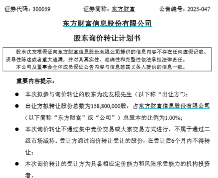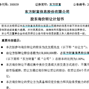 7月18日晚,东方财富发布《股东询价转让计划书》。公告称,股东沈友根计划通过询价转让方式转让股份15880万股,占公司总股本的比例为1%。转让原因为个人资金需求。