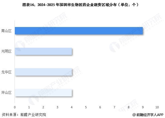 从融资区域分布情况来看,深圳市生物医药产业融资主要分布在南山区、光明区、龙华区和坪山区,其中,南山区生物医药产业融资最为活跃,作为深圳市生物医药产业的重要集聚地,吸引了大量资本的投资。近年来,南山区内的生物医药企业频繁获得融资,单笔融资额也相对较高。整体来说,深圳市生物医药产业融资呈现“南山主导、多点开花”的特征。