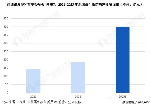 根据深圳市发展和改革委员会披露的数据,2021年深圳市生物医药产业增加值约为146亿元,2023年为186亿元,根据《深圳市培育发展生物医药产业集群行动计划(2022-2025年)》,深圳市计划2025年生物医药产业增加值达到400亿元。