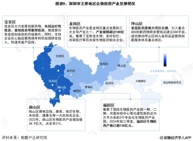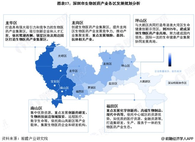 从深圳市生物医药产业区域功能规划来看,坪山区计划到2025年,与大鹏新区共同建成深圳生物医药产业高地,努力建成国内领先、国际一流的生命健康产业集聚协同发展高地;龙岗区重点发展细胞、基因、抗体相关产业,南山区和福田区则重点发展创新药、现代中药等。