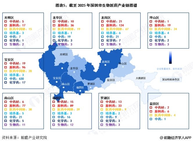 截至2025年3月,深圳市龙华区、龙岗区、宝安区、南山区和福田区等均围绕生物医药出台了一系列产业政策,通过资金补贴、技术研发奖励、鼓励人才领域等方式,推动生物医药产业发展。