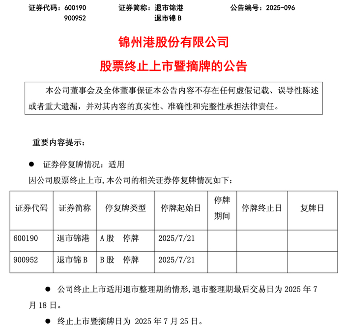 根据《上海证券交易所股票上市规则》的相关规定及安排,上海证券交易所将在2025年7月25日对退市锦港股票予以摘牌,公司股票终止上市。