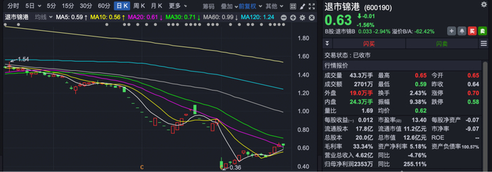 截至今年一季度末,退市锦港的股东总户数为7.88万户。截至7月18日收盘,退市锦港报收0.63元/股,总市值12.61亿元。