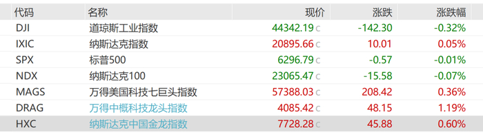截至收盘,标普500指数跌0.01%,报6296.79点;纳斯达克综合指数涨0.05%,勉强再创收盘历史新高,报20895.66点;道琼斯工业平均指数跌0.32%,报44342.19点。