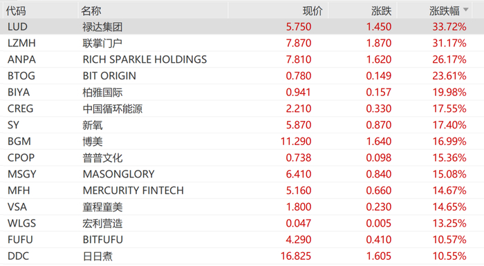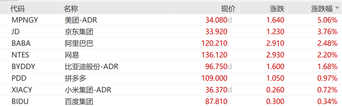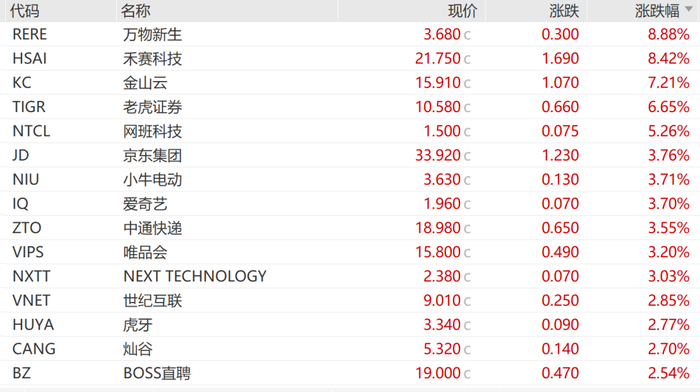 禄达技术暴涨超33%,新氧大涨超17%,爱回收、慧择涨超8%,富途控股、金山云涨超7%,老虎证券超6%,京东、爱奇艺、小牛电动、唯品会涨超3%,阿里巴巴、哔哩哔哩、网易、携程、房多多、虎牙等涨超2%。