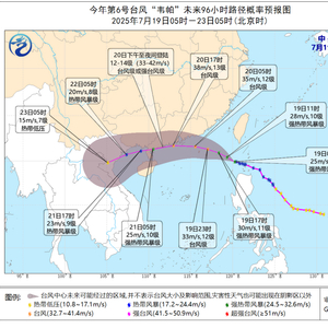 预计,“韦帕”将以每小时15~20公里的速度向西偏北方向移动,即将移入南海东北部海面,强度逐渐加强。将于20日下午至夜间在广东深圳到海南文昌一带沿海登陆,登陆时强度为台风级或强台风级(12~14级,33~42米/秒)。7月19日08时至20日08时,受“韦帕”和西南季风的共同影响,南海东北部海域、巴士海峡、台湾海峡北部海域风力可达8~10级,阵风11~12级,台风中心经过的附近海域风力有10~12级,阵风13~14级。