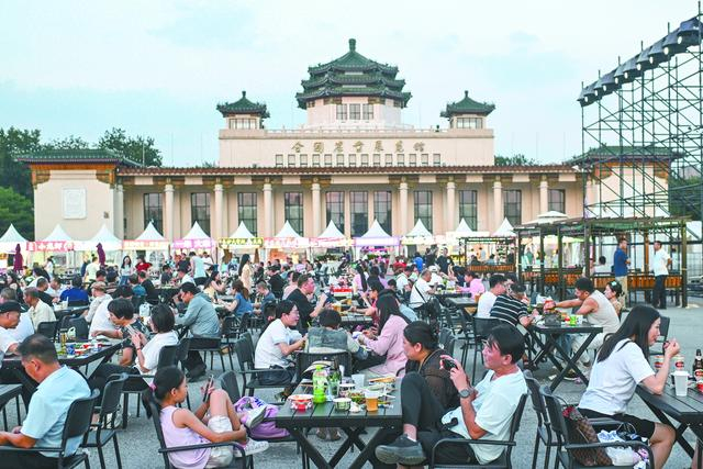 图片说明: 当白天的燥热渐渐消退,北京城夜间的活力开始悄然绽放。图为7月18日晚,北京市民在全国农业展览馆夜市享音乐、品美食。