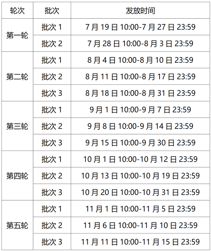 本次消费券发放分为5轮,共计14批次。具体发放时间设置如下: