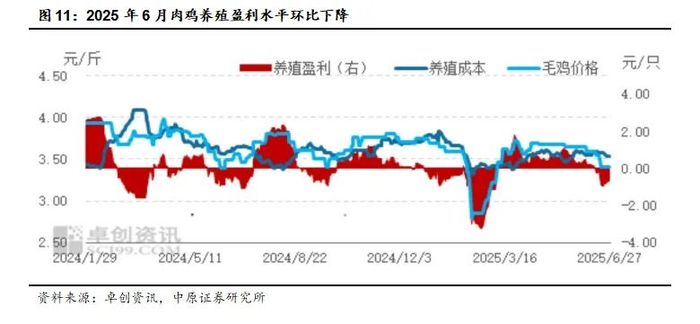 根据卓创资讯跟踪,6月份肉鸡养殖盈利预估值为-0.24元/只,环比下滑0.89元/只,同比上涨0.38元/只;2025年1-6月肉鸡养殖盈利预估值为-0.22元/只,同比下滑0.49元/只。6月毛鸡均价环比跌幅较大,导致养殖收入随之下滑;月内出栏肉鸡对应养殖成本微涨,但涨幅不大,主要受毛鸡价格下滑影响较大,月内肉鸡养殖由盈转亏。7月出栏肉鸡月均养殖成本或下滑,预计7月肉鸡养殖端利润或延续。