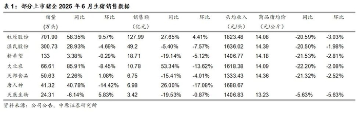 从销售数据来看,2025年6月,受猪价低迷影响,猪企商品猪销售月均价同环比下跌;其中,牧原股份商品猪头均收入相对较高,达到1823.48元/头。从出栏量来看,牧原股份出栏量和同比增速遥遥领先,2025年6月共出栏生猪701.90万头,同比增长58.35%;6月温氏股份、大北农、唐人神出栏量同比增速较高,分别达到28.93%、85.91%、40.78%。