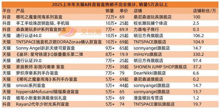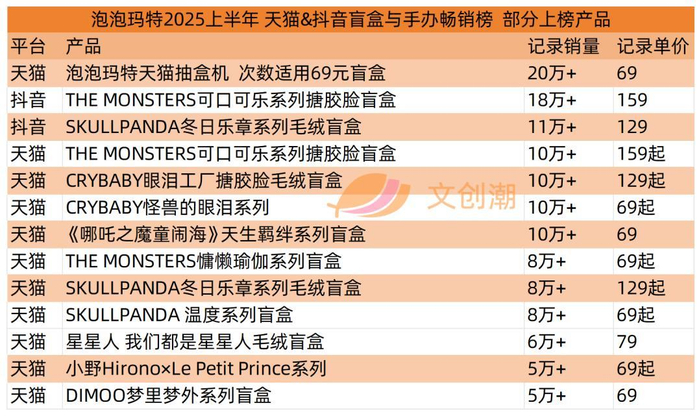 上半年,文创潮“文创新经济周汇”栏目发布了26期文章,天猫与抖音盲盒热销榜上泡泡玛特以外品牌的产品,销量达到5万与10万以上的有:
