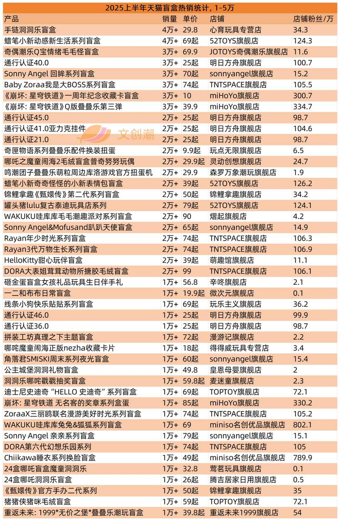 文创潮“文创新经济周汇”栏目对天猫盲盒热销榜的26周统计显示,累计销量达到2万以上5万以下的有(这一区间抖音爆款与天猫高度重合,我们不另做解读):