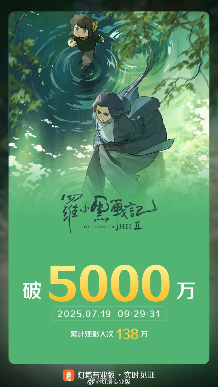 据灯塔专业版实时数据,截至7月19日9时29分,影片《罗小黑战记2》票房突破5000万。