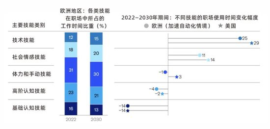 其中,技术技能与社会情感技能的需求增长最为显著。根据麦肯锡的预测,如果AI发展继续加速,到2030年,技术技能在美国职场所占工作时间的比重将比2022年增长29%,欧洲则增长25%。这一数据在社会情感技能上,则是分别增长14%和11%。