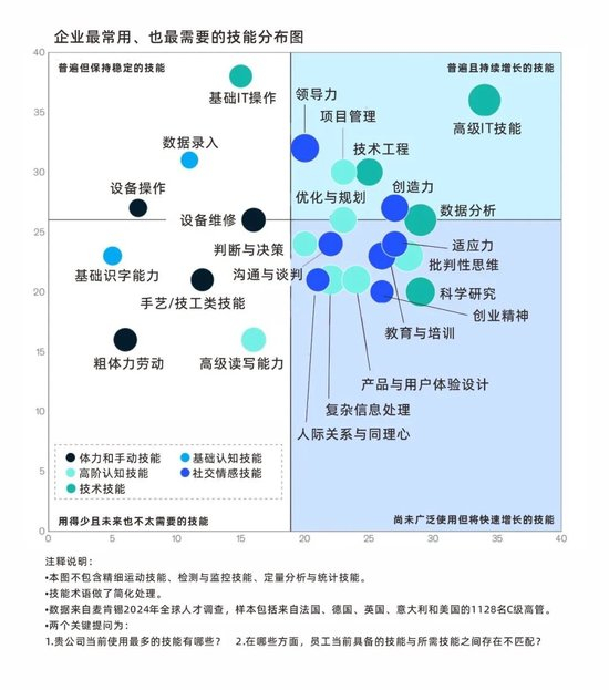 就像麦肯锡在报告中提到的那样:在未来的职场格局里,无数工作岗位刚被重新定义和分配。而这背后,有五大就业技能密切相关,分别为:技术技能、社会情感技能、体力和手动技能、高阶认知技能、基础认知技能。