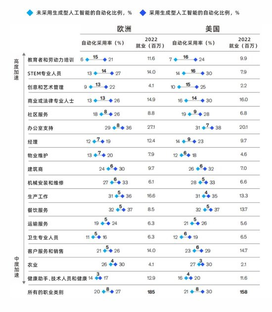 麦肯锡在报告《工作的新未来》中指出,到2030年,美国将有30%的岗位直接受到生成式AI的影响,而欧洲这一比例为27%。