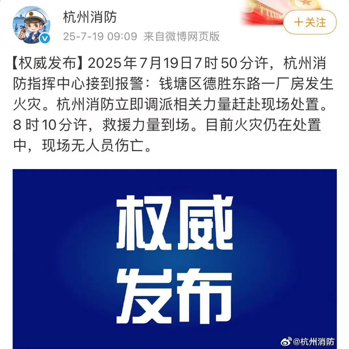 记者从杭州消防发布的信息了解到,7月19日7时50分许,杭州消防指挥中心接到报警:钱塘区德胜东路一厂房发生火灾。8时10分许,救援力量到场。目前火灾仍在处置中,现场无人员伤亡。