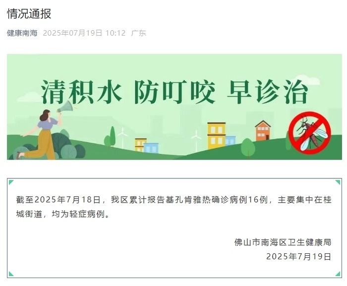 7月19日,佛山市南海区卫生健康局通报:截至2025年7月18日,南海区累计报告基孔肯雅热确诊病例16例,主要集中在桂城街道,均为轻症病例。