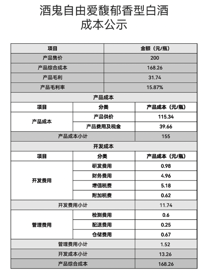 该款白酒属馥郁香型,酒精度数为52度,容量550ml,定价200元/瓶。同时,胖东来一贯坚持“信息透明”原则,公布了该款产品的成本构成表:产品综合成本168.26元,产品毛利31.74,产品毛利率15.87%。