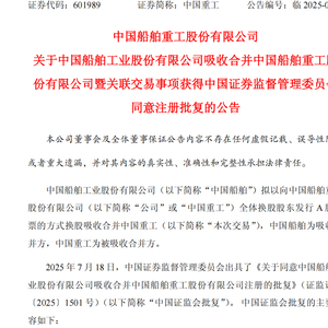 2025年7月18日晚间,两家公司发布公告称,中国证监会出具了《关于同意中国船舶工业股份有限公司吸收合并中国船舶重工股份有限公司注册的批复》。这标志着,中国船舶换股吸收合并中国重工项目,顺利取得中国证监会同意注册批复。