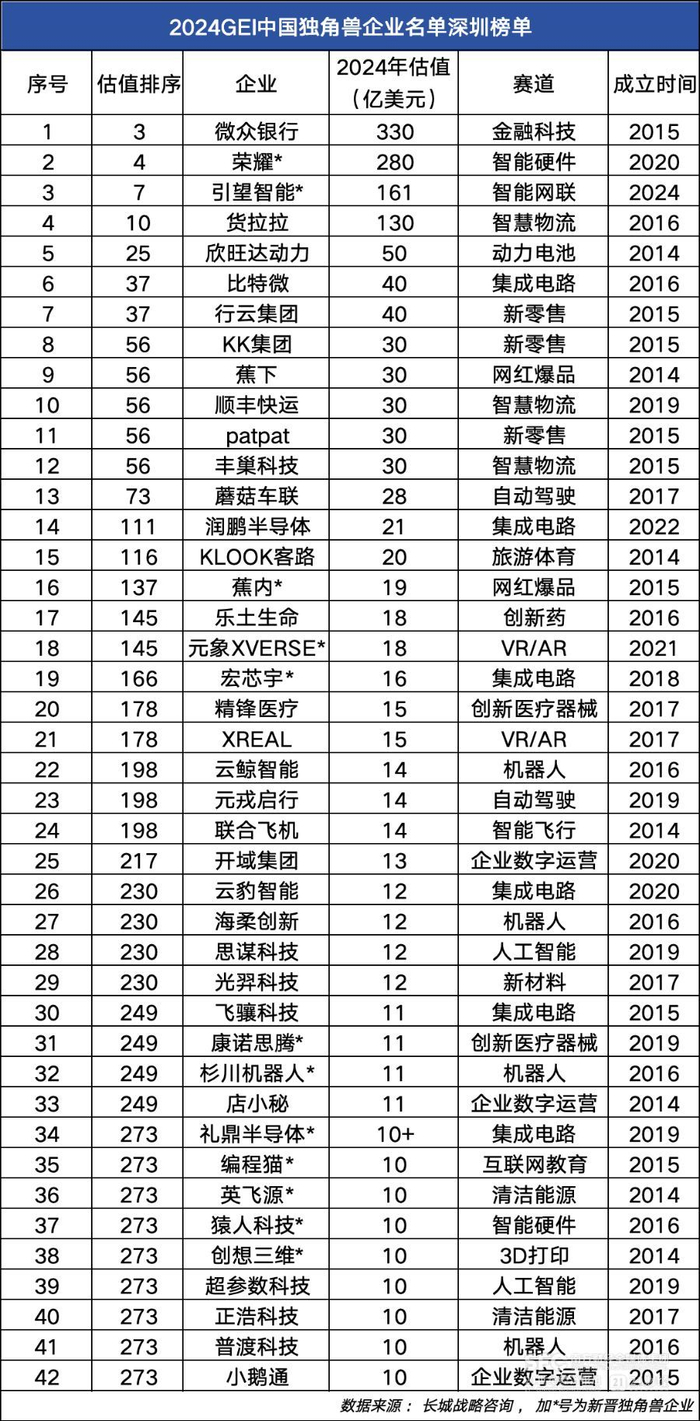 时隔12年,深圳已然成为培育硬科技独角兽企业的沃土。根据《GEI中国独角兽企业研究报告2025》(简称《报告》),2024年中国独角兽企业372家,其中,深圳独角兽企业42家,总估值1599亿美元,平均估值37.1亿美元;新晋独角兽企业13家,数量全国第一,占全国新晋独角兽企业总量的四分之一。