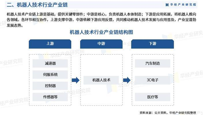 机器人技术产业链上游是基础,提供关键零部件;中游是核心,负责机器人本体制造;下游是应用拓展,将机器人推向各领域。各环节相互协作,上游支撑中游,中游依赖下游应用反馈,共同推动机器人技术发展与应用普及,产业呈蓬勃发展态势。