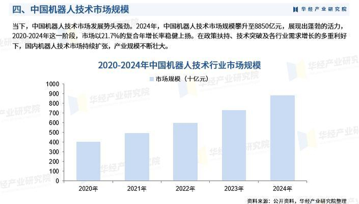 当下,中国机器人技术市场发展势头强劲。2024年,中国机器人技术市场规模攀升至8850亿元,展现出蓬勃的活力,2020-2024年这一阶段,市场以21.7%的复合年增长率稳健上扬。在政策扶持、技术突破及各行业需求增长的多重利好下,国内机器人技术市场持续扩张,产业规模不断壮大。
