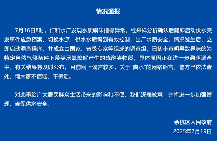 7月19日,杭州余杭区政府就仁和街道及良渚街道部分区域出现自来水气味异常发布情况通报: