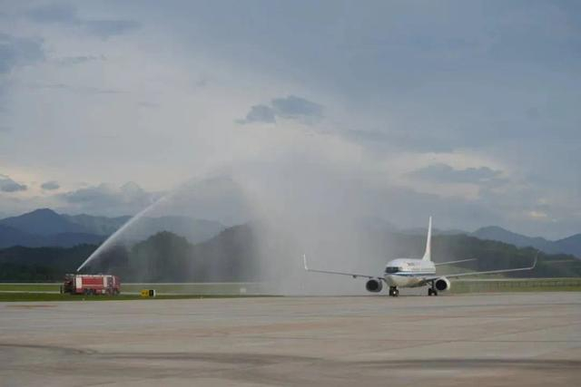 7月18日17时33分,备受期待的首架进港航班——由北京首都机场飞抵丽水的CA1873次航班缓缓驶入由水柱构筑的“水门”,接受丽水机场准备的民航界最高礼仪“水门礼”。滑行了一段时间后,飞机稳稳停靠在指定机位,丽水机场成功迎来首架商业航班。