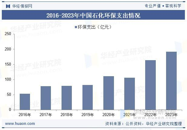 近年来,国家大力推广与油田环保相关的节能减排、循环经济政策,国内三大石油公司加大对油田勘探开发过程中的环保投入力度。以中国石化为例,2016年至2023年,中国石化环保支出整体呈增长趋势,由53.6亿元增长至191.56亿元,年均复合增长率达到19.96%,环保支出总体呈逐年上升趋势且增长速度较快,将促进油田环保技术服务市场规模逐步扩大。