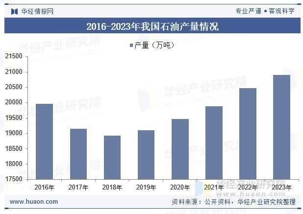 石油产业是我国重要的能源产业之一,对于国家经济发展和能源安全具有重要意义。随着国家经济的快速增长和能源需求的不断增加,石油产业的规模和发展速度也呈现出良好的态势。根据国家统计局数据显示,2016年,受油价持续低迷影响,国内石油公司被迫关停低效井,同时削减高成本油田产量。2018年,我国石油行业在短暂调整后,石油产量开始恢复增长。截至2023年末,我国石油产量达20902.6万吨,较2022年同比增长2.1%,2018年至2023年年均复合增长率为2%,整体处于增长状态。