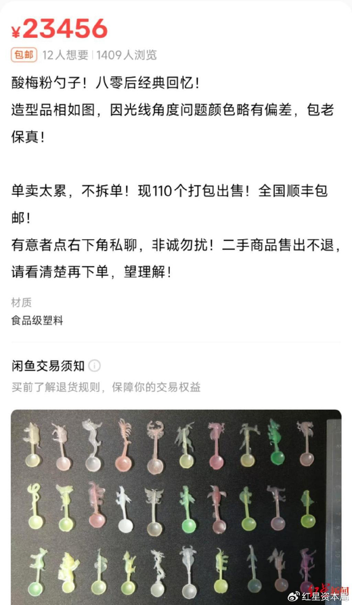 红星资本局7月19日消息,近日,80后童年回忆酸梅粉小勺走红。曾经一毛钱一袋的酸梅粉,其附赠的小勺如今在闲鱼平台身价过百。有卖家打包出售110个系列小勺,价格达到2.2万元。