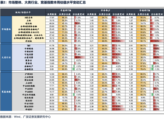 市场整体来看,本周A股总体估值扩张。其中,创业板扩张幅度最大。大类行业来看,本周行业估值多数扩张,其中必须消费、中游制造、可选消费扩张幅度较大。宽基指数看,本周指数多数估值扩张,其中,深圳成指、中证500、国证2000扩张幅度较大。